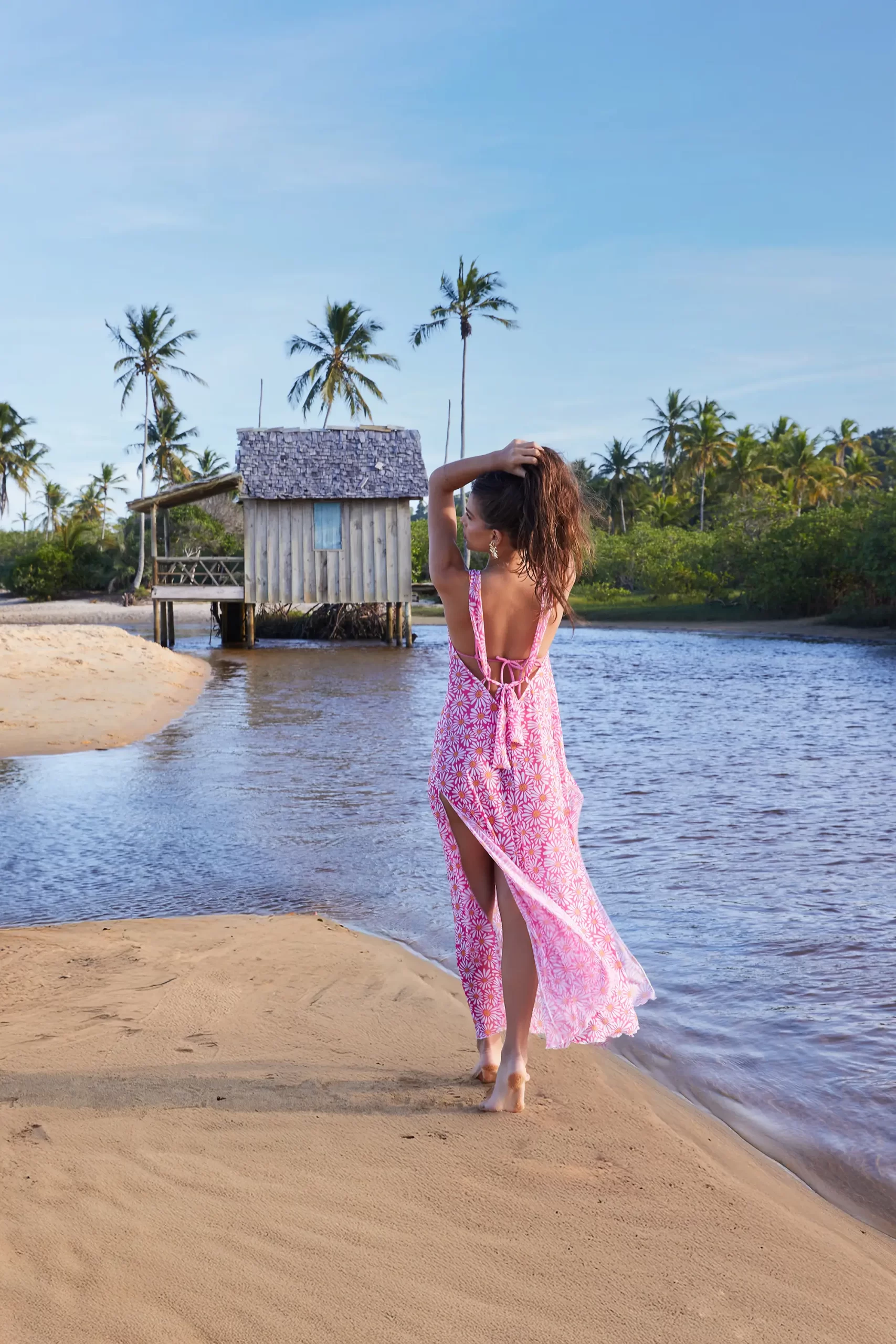 Saída de praia longa com fendas laterais e amarração na cintura, proporcionando um visual fluido e elegante.